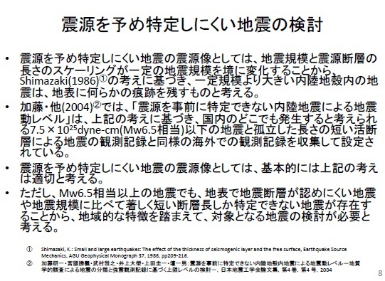 5 ・ 震源を特定せず策定する地震動 チーム 第 2 回 会議 第2回、会合においても、貴重な分析資料等が公開された。 第1回会合、平成30年2月22日 (原子力規制委員会) http://www.nsr.go.jp/disclosure/committee/yuushikisya/tokuteisezu_jishindo/00000004.html 標準応答スペクトル の策定に係る対象地震の選定 http://www.nsr.go.jp/data/000221717.pdf 全国共通に考慮すべき「震源を特定せず策定する地震動」について、標準応答スペクトルの策定に必要な対象地震を収集整理し、諸条件に見合う地震を選定する。 〇選定方針(方法) 防災科学技術研究所F-netの震源メカニズム解検索により、「0次地震リスト」を作成する。 【条件】 観測期間: 2000年1月1日〜2017年12月31日 震源深さ: 0〜20km (気象庁) 地震規模: Mw 5.0〜6.9 (F-net の震源メカニズム情報) 地震調査研究推進本部地震調査委員会(2014)による「陸域の震源断層をあらかじめ特定しにくい地震の領域」区分を参考に、地震の震央がおおむね大陸〜大陸棚周辺に位置する内陸地殻内地震を抽出し、「0.5次地震リスト」を作成する。 防災科学技術研究所KiK-netの地震検索により、「1次地震リスト」を作成する。 ・・とされた。 なお、統計処理の対象となる地震規模は、Mw 5.0〜6.6、とされた。 原子力規制委員会 ・ 2018/0222 http://www.nsr.go.jp/data/000221717.pdf 通称 「地震ガイド」 で、削除された、 2004年、新潟県中越地震 (Mw 6.6) 2007年、新潟県中越沖地震 (Mw 6.6) 等の、強振動の地震が網羅されて、より正しい基準地震動の策定が見込まれる。 |