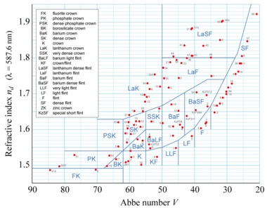 2.光学ガラスについて 光学ガラスとは、均一な一定特性をもつ透明なガラスのことで、珪酸SiO2 を主成分としています。一般にアッベ数v が50以上(横軸)のものをクラウンガラス、50以下のものをフリントガラスと呼びます。ガラスの屈折率は、1.5〜1.9程度です(縦軸) 通常のアクロマートレンズの場合、前面の凸レンズにクラウンガラス(BK7等)、後面の凹レンズにフリントガラス(F2等)を使います。BK7はレンズ以外にもプリズム等にも良く使われるガラスで、安価で物理的、化学的特性にも強いために重宝されます。3枚玉スーパーアポクロマートの相玉としても使われます。 光学ガラス製造メーカーは、独ショット、日本のオハラ 等がメジャーです。(BK7等はショット社の商品名です) ![]() ショット・光学ガラス |