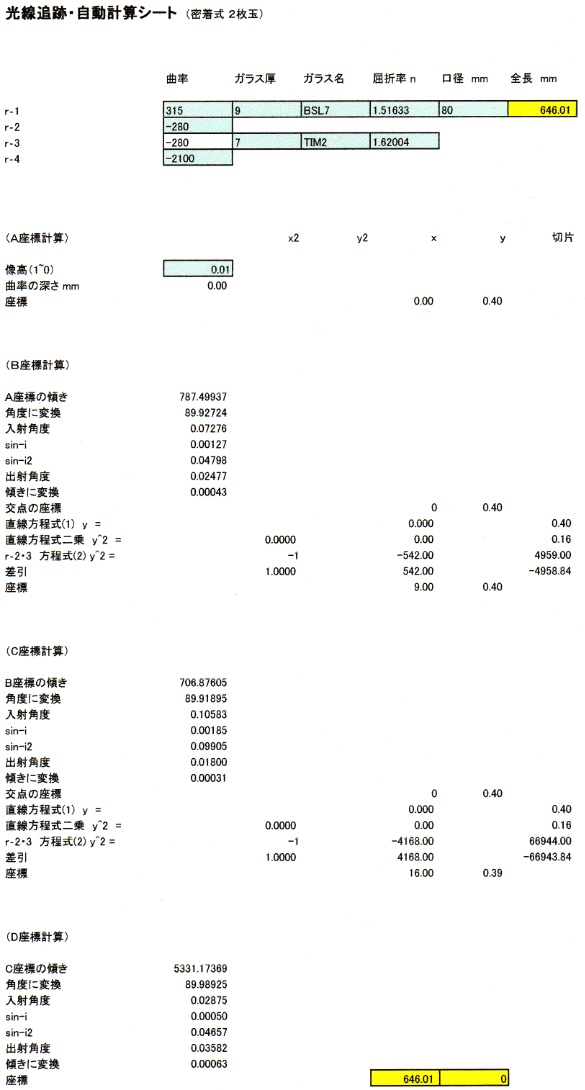 ★ アクロマート 対物レンズ設計 方程式に代入して、2枚玉 アクロマート対物レンズの設計(曲率半径 r1-r4 の決定)をしてみます。 ガラス材はBSL7(BK7)、TIM2(F2) を使用します。(広義の)フランホーフェル型(リトロー型)、曲率半径の内、2面のr2、3面のr3は同曲率で設計します。 スポット etc (基礎データ) BK7 nd 1.5163 vd 64.14 凸レンズ (f1,n1,v1) F2 nd 1.6200 vd 36.25 凹レンズ (f2,n2,v2) 口径 80mm 焦点距離 640mm (F8) (リトロー公式) f1 = ((v1-v2)xf)/v1 f2 = ((v1-v2)xf/v2 r1 = 2(n1-1)xf1 r2 = -r1 r3 = r2 r4 = 1/(((1/r3)-(1/((n2-1)xf2)))) f1 = ((64.14-36.25)x640)/64.14 = 278.3 f2 = ((36.25-64.14)x640/36.25 = -492.4 r1 = 2(1.5163-1)x278.3 = +287.4 r2 = -r1 = -287.4 r3 = r2 = -287.4 r4 = 1/(((1/-287.2)-(1/((1.6200-1)x-492.4)))) = -4893 ・・・ 単位 ミリ、となります。 (エクセル自動計算シート) ![]() ★ 2枚玉レンズの光線追跡&球面収差図の作成 スネルの法則と三角関数、微分、二次関数連立方程式等を使った、古典的な実光線追跡シミュレーションです。レンズ前面の中心の座標を(0,0)として計算します。 各座標を順次計算します。 座標 A 入射光線とレンズ1面との交点 ↓ 座標 B 入射光線とレンズ2・3面との交点 ↓ 座標 C 入射光線とレンズ4面との交点 ↓ 座標 D 入射光線とのレンズ軸線と交点 座標 Dの x値が、レンズ系の全長l となります。(バックフォーカス+ガラス厚み) (バックフォーカス+後側主点 =焦点距離です。) 入射光線の角度はゼロ≒平行光とします。 |