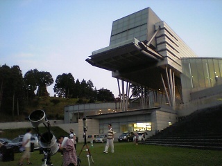 ★ 2011年 8月27日 ・ 佐賀武雄 ゆめぎんが天文祭 佐賀県立・宇宙科学館(ゆめぎんが)の星祭りです。 1階、裏側の芝生スペースは広く、そこに10台程の望遠鏡が並び、天候にも恵まれ大勢の人が集まり盛況でした。アルビレオ等の対象を見ることが出来ました。夕方はゲストの講演会等もありました。 科学館には、タカハシのTOA−130、そしてFS−102が数台と、贅沢な高級アポクロマート屈折が勢揃いです。 200〜400mmの大口径望遠鏡、プラネタリウムもあります。 武雄 ・宇宙科学館 毎週、土曜日の夜は、定例観望会も開催されています。 ![]() |