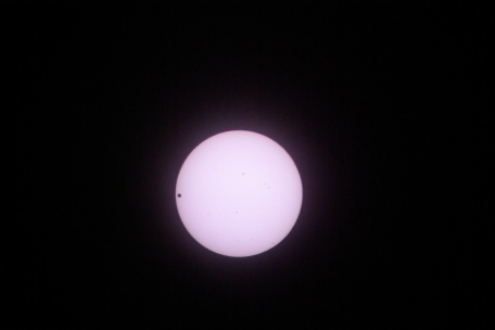 ★ 2012年 6月6日 ・ 金星日面通過 朝7時過ぎ〜 第1・第2 接蝕は、ほぼ快晴となり、その後の第4接蝕まで、まあまあの天気に恵まれました。 第1・第2接蝕間の時間は、約 17分。望遠鏡での眼視観測では、刻々と動いているようなスピード感がありました。また特に、第2・第3 接蝕は、ブラックドロップ現象が見られるかが注目されましたが、今回は? 極黒の金星は、本当に素晴らしい臨場感がありました・・ ![]() 780 (50絞り)mm 新型アクロマート 露出 1/4000秒 ペンタックスK10D 画像処理は特になし。 ![]() (拡大画像 800% ) |