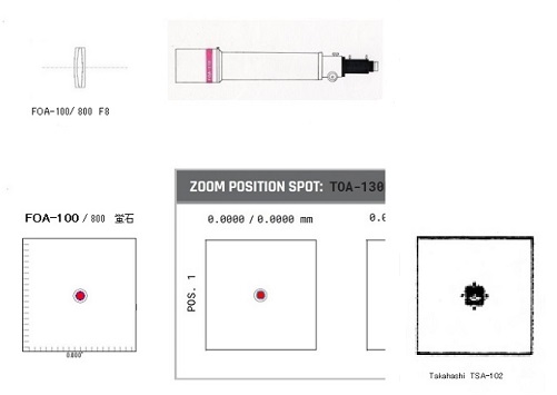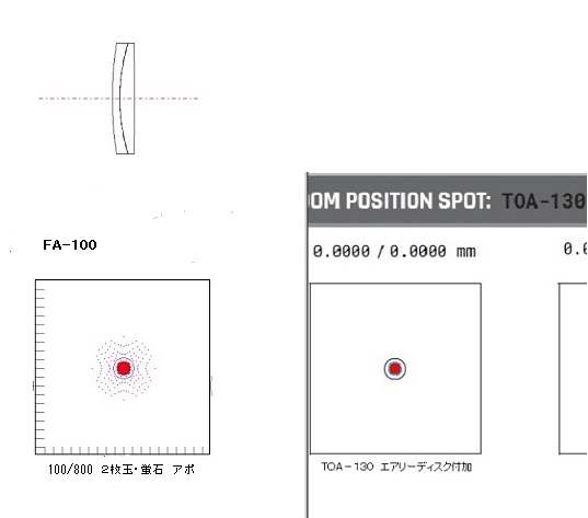 ★ 100mm F 8.0 フローライト・アポクロマート フローライト ・アポクロマートの最新設計 (デジタル対応)鏡筒です。 100mm ・2枚玉アポクロマート フローライトの相手玉は、オハラの高屈折クラウン系ガラスを使用、短焦点の2枚玉でありながら、青ハロの発生を抑え、眼視・写真共にシャープな、スーパー・アポクロマートに仕上がっています。 CdeF の4線の補正は良好。 多色ストレールレシオ は、約 95%です。収差補正に関し、3枚玉に近い高性能アポクロマートです。 温度順応時間は、 3枚玉より短く快適です。 レンズ構成図 (2枚目 フローライト) ![]() 球面収差図 100mm F 8.0 800mm ![]() (備考) 100 〜 130mm、スポット比較 1 ![]() |