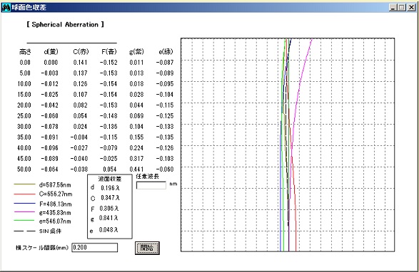 ★ 100mm F 8.0 フローライト・アポクロマート フローライトを使用し、相手レンズはショット ・ クラウンフリント (KF6) を使用しています。 KF6 の特性は、クルツフリント (KZF5) ※ と近似しています。 温度順応時間は 3枚玉より短く快適です。CdeF の4線の補正は良好。 多色ストレールレシオは、約 90 %です。 ○ apochromat construction r1 = 322.2mm/7.0mm/KF6 r2 = 165.8mm/0.1mm/AIR r3 = 165.3mm/14.0mm/CAF2 r4 = -3130mm/785.9mm/AIR レンズ構成図 (2枚目 フローライト) ![]() 球面収差図 100mm F 8.0 800mm ![]() ※ クルツフリント(KZF5)は、ビクセン製・アポクロマート対物レンズでも使用。 |