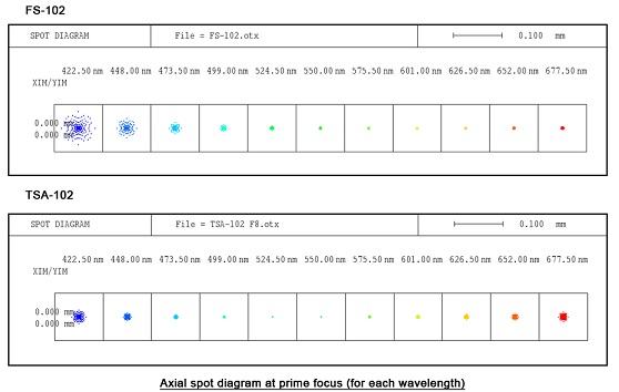 ★ 100mm F 8、 2 枚玉・標準 アポクロマート 設計指針 標準10cm・アポクロマート。球面収差を、バランス良く補正する必要があります。 月・惑星用アポクロマートの場合、CdeF 4線色消し にする必要があります。g線もそれなりの補正が必要です。特に、C線 (赤) が肥大すると、青ハロが少ないにも関わらず、細部の描写がやや落ちるレンズとなります。 全体的に白っぽく、赤色の模様等が不明瞭な描写となります。 (TSA-102 等) 色収差 (青ハロ)と、月・惑星の解像度(分解能)、シャープネスが、相反する例です。 球面収差図 ・ スポット 図を分析すると・・ TSA-102 → deF 3 線色消し FS -102 → Cde 3 線色消し 2枚構成アポクロマートは公差感度等が緩く、製造が容易であり、更に運用(観測)時においても、 温度順応が速い等のメリットが多くあります。 スポット 図 102mm F 8.0 比較 ![]() タカハシ欧州 ☆ http://www.takahashi-europe.com/en/TSA-102.optics.php