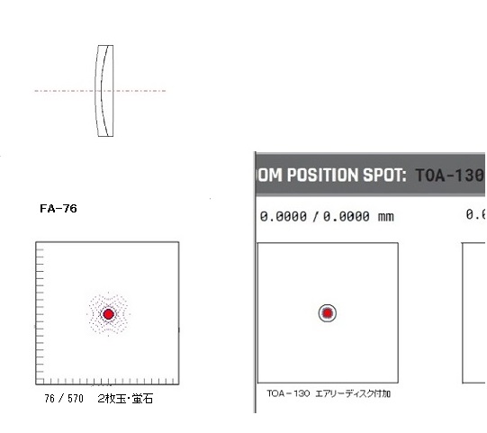 ★ 76mm F 7.5 ・2枚玉 フローライト・アポクロマート 古典的 スタインハイル式、フローライト ・アポクロマートの最新設計 (デジタル対応)鏡筒です。 フローライトの相手玉は、低コストのクラウン系ガラスを使用。短焦点の2枚玉でありながら、青ハロの発生を抑え、眼視・写真共にシャープな、アポクロマートに仕上がっています。 比較・スポット etc CdeFg 5 線 の補正は良好で、レイリー値の軸上許容値である約 10μ の中にほぼ収まっています。 レンズ・基本構成図 ![]() スポット 図 (76 mm F 7.5 / 570 mm ) ![]() 中心 スポット図 C〜F線 (d線 スポット径、約 10μ) ![]() C〜g線 5線に関し、約 100%が、d線 の波動光学スポット径の中に集光します。(幾何光学基準) フラットナーは 2枚構成、イメージサークルΦ40mm(光量 80%)、中心スポット約 10ミクロン 周辺約 15ミクロン、中心〜周辺全面で、ほぼ ピンポイント星像です。 フォトビジュアル望遠鏡・設計指針