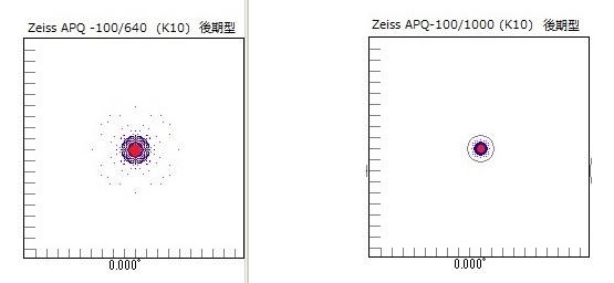 ★ ツアイス APQ 100/1000mm 蛍石・アポクロマート フローライト使用 ・ 3枚構成の、スーパー・アポクロマートです。 レンズ構成、BAK2-CAF2-K10 (後期型) 、F 10 と余裕があり、球面収差 (軸上色収差) 補正は極めて良好です。 多色ストレールレシオは、約 98 %です。 ![]() ツアイスAPQ、他機種と比較すると、そのシャープネスが際立ちます。口径mm 3.5倍、(350倍) 対応 スーパー ・蛍石 アポクロマートです。 ![]() ![]()
