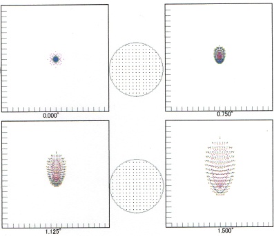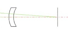 ○ ペッツバール和 計算 &スポット図 2枚玉対物レンズは、像面が大きく歪んでおり、直焦点写真の場合、ペッツバール和 を小さくして、 像面の平坦化を行います。 d 線 屈折率 n / 焦点距離 f KZF5 → 1.52130 / - 532.6 mm CAF2 → 1.43387 / 288.7 mm 計算式 → 1/(n1*f1) + 1/(n2*f2) … Σ 1/(n*f) = 0 1/(1.52130 * - 532.6) + 1/(1.43387 * 288.7) ≒ + 0.0012 (判定、大幅なプラス) ペッツバール和 を小さくする為には、凹 メニスカス・フラットナー の挿入が必要です。レンズの厚み等を考慮すると、- 0.0008 前後が良好です。 ![]() ○ スポット図 (フラットナー装着) スケール 200μ ![]()