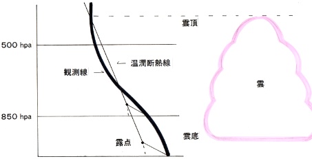 雲頂高度は、湿潤断熱線と観測線が、再び交わった地点となります。