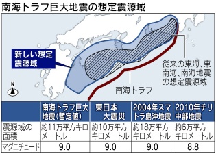 ★ 2012年 9月1日 ・ 防災の日 東日本巨大地震から、約 1年半。内閣府・防災部門等で、南海トラフのM9・超巨大地震のシミュレーションもある程度固まりましたが、地震発生後の津波高、モーメントマグチュード 等の速報データ提供が不可欠な、 気象庁 (国土交通省)のシステム改善の進捗は遅く、年度末 (2013年3月)待ちの様子です。 一方、大学・防災研究所等での調査研究も、順調とはいかない様子です。 東海〜南海・日向沖、4連動型 超巨大地震 (内閣府・防災部門) Mw 9.1 〜 被害想定 (死者 32万人) http://www.bousai.go.jp/jishin/nankai/nankaitrough_info.html ![]() |