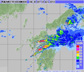 ★ 2012年 7月 ・ 北部九州豪雨 2012年・梅雨時期の短時間豪雨は、北部九州各地で発生しました。上空の高湿度の大気が収束して、下のレーダーアメダス図 (気象庁) のような「にんじん雲」が幾つも発生し、福岡県南部・熊本県北部を中心に、記録的な雨量となりました。3時間雨量は、多い所で 200mmを超えました。 現在の気象庁の技術では、豪雨の正確な予報は困難ですが、将来的には精度が高まり、より防災に役立つことを期待したいものです。 ![]() |