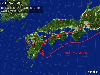 ★ 2017年 6月21日 ・ 南海トラフ ・ M 9 + 超巨大地震 南海トラフ М9+ 超巨大地震の発生予想震源域の南西側の境界域において、М5前後の地震が、 数多く発生しています。 四国の内陸部も、低周波地震が活発に発生しており、いよいよ最終段階に入ったことが伺えます。 (備考) 地震調査研究推進本部・南海トラフ地震の長期評価 http://www.jishin.go.jp/main/chousa/kaikou_pdf/nankai_2.pdf ![]() |