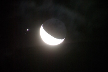 ★ 2012年 8月12日 ・ 木星食 福岡では接近に留まりましたが、時折雲間から見える姿を、楽しむことが出来ました。 月齢は約 23とやや明るくかったですが、地球照が薄く見えており、木星とその衛星(2つのみ見えました) との競演は素晴らしい眺めでした。なお金星食は、14日早朝となります。 ![]() 73mm新型アクロマート 露出 1秒 ISO800 ペンタックスK10D 画像処理は特になし。JPEG/AWB、