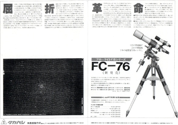 ○ タカハシ FC−76 フローライト (1981〜) 屈折革命 〜 短焦点 フローライト屈折。 F 8 → F 6 、レデューサ使用で、2本分の望遠レンズ&望遠鏡 (フォト・ビジュアル) というコンセプトの鏡筒を、世界で初めて量産しました。 当時は、短焦点反射による直焦点写真が盛んでしたが、より広視野 (中版 56x42 mm) の直焦点写真にも対応可能、かつ月惑星・星雲星団 (低倍率〜高倍率)の眼視にも対応可能なフローライト屈折は、当時の天文マニアからの、絶大の支持が集まりました。 現在は、青 f線〜紫 g線ハロの少ない、FC−76 D が発売されています。 (天文ガイド、1981年 4月号) ※ ![]() ※ 福岡の図書館より、お借りしました。 |