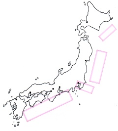 ★ スーパー東南海 (東海〜南海・日向沖 4連動) 他、巨大地震予測の検証 日本付近は、北米・ユーラシア・太平洋・フィリピン海 の、4つの巨大なプレートに囲まれており、それぞれの プレート境界線で、過去幾度も巨大地震が発生しました。 大規模な固着領域 (アスペリティ)は、日本本土付近においては、南関東、三陸沖、根室沖、東海〜日向沖の4エリアに存在し、エネルギーが蓄積しています。 特に、近年中に発生が予測されるのが、東海〜南海、3連動 M9 弱の地震とされています。 ユーラシア 〜フィリピン海プレートの境界で発生し、想定される震源域の長さは、約 700km、幅 120km、平均変位量 6m、モーメント・マグニチュード Mw は、8.8 前後 (宝永地震クラス※1)と推測されます。 数千年周期と言われる 4連動・超巨大地震は、Mw 9.0〜9.1 前後と推測されます。 北米 〜 フィリピン海 プレートの境界 (南関東)でも、巨大地震が発生する可能性があります。特に、 東京直下〜房総沖は、極めて大きい固着領域 (アスペリティ)で、警戒が必要です。 また近年は、スーパーサイクルを超える ウルトラサイクル(Mw 9.5 クラス) のモデルも提唱されており、 東日本全体に、破局超巨大地震が発生する可能性もあります。 ■ プレート境界型 ・巨大地震 一覧