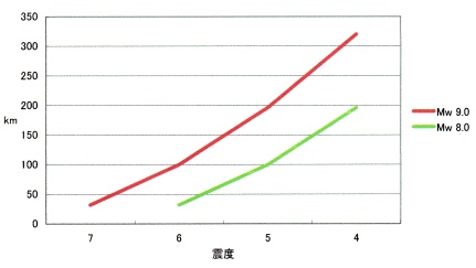 ★ モーメント・マグニチュード 速報モデル 2 (震度分布モデル) 地震の規模・エネルギー (モーメント・マグニチュード Mw ) が大きい地震は、断層の長さ (≒震源域長 ) が増加、それに応じて強震域(震度分布) がより広範囲に拡大します。 巨大地震のモーメント・マグニチュード Mw 〜 震度分布 の関係式、 震源域の境界より、200km地点における基準震度は、Mw - 4.0 前後に近似します。 (例) Mw 9.0 → 震度 5.0 各震度(x)における、分布領域の距離倍数は、0.16x^2 -0.8x +1 (仮) (グラフ) ![]() 推定震源域境界からの距離と、平均震度から、モーメント・マグニチュード Mw の推測が可能です。 (モデル・パラメータ) Mw 9.0 ≒ 550 km x 200 km x 0.010 km Mw 8.0 ≒ 180 km x 60 km x 0.003 km (311、震度 5強〜 分布図) ![]() 311における、Mw 8.8 及び 8.0 の震度 5強 〜 (100ガル・1秒周期) 超 エリアの震度分布図です。 Mw 8.8 になると、東京〜青森 約 600kmに渡り、強震域が分布します。 震度 5強〜6強 エリアの震度分布の長さ L km で、 Mw = 2.0logL+3.2 前後に近似します。 震度 5強〜6強 エリアの震度分布の面積 S km2 で、 Mw = logS+3.4 前後に近似します。 (Mw 速算式 ≒ log32 SD + 7.0 ) ○ 巨大地震の規模、及び津波高の即時推定 |
