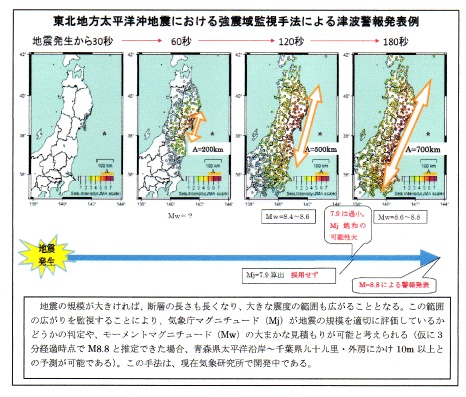 ■ 東北地方太平洋沖地震による津波被害を踏まえた津波警報の改善の方向性について (気象庁) http://www.jma.go.jp/jma/press/1109/12a/torimatome.pdf M8 を超えるような巨大地震や津波地震の場合には、その規模を 3分程度で正確に算出可能な手法は現在及び当面存在しないことから、津波の規模を過小に評価するMjを使わず、次の手法を導入し迅速性を確保しつつ津波警報を改善する。具体的には、津波警報第1報を発表する前に地震の規模を過小評価している可能性を速やかに認識できる監視・判定手法を用意する ![]()